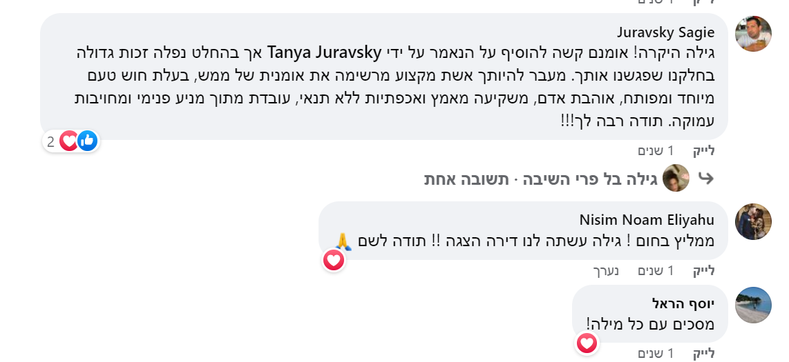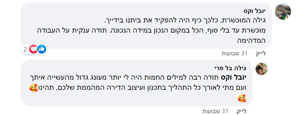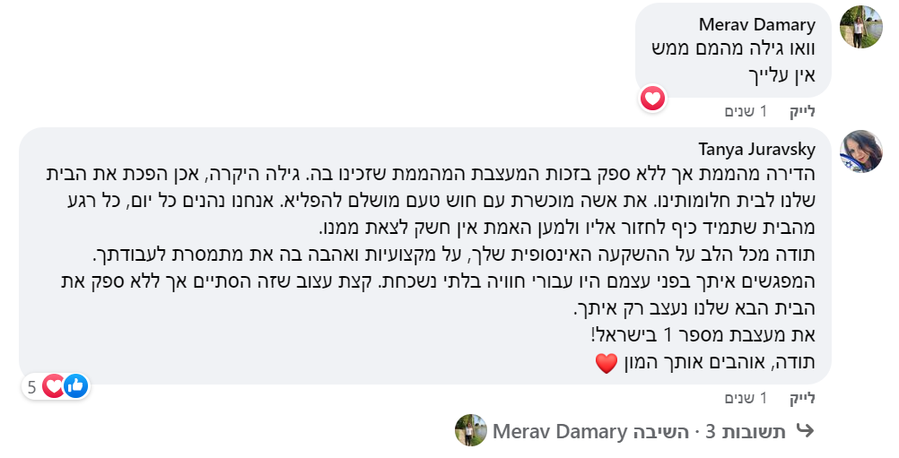 מבחינתי לבצע עיצוב פנים בית פרטי או עיצוב פנים לדירות קטנות וגדולות זה לתכנן לאדם את הבית שבו הוא עומד להתגורר זה קצת לעזור לו לנהל את חייו, ואני מרגישה מבורכת בעשייה שלי.